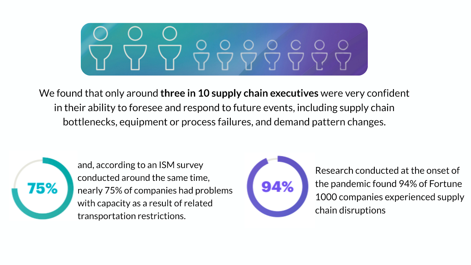 It’s been well documented, for instance, that COVID-19 caused large-scale supply chain disruptions, risks, and uncertainty that nearly paralyzed companies for a time, largely due to a combination of unforeseen demand spikes and insufficient capabilities to respond to them—and these challenges are still wreaking havoc in companies today.