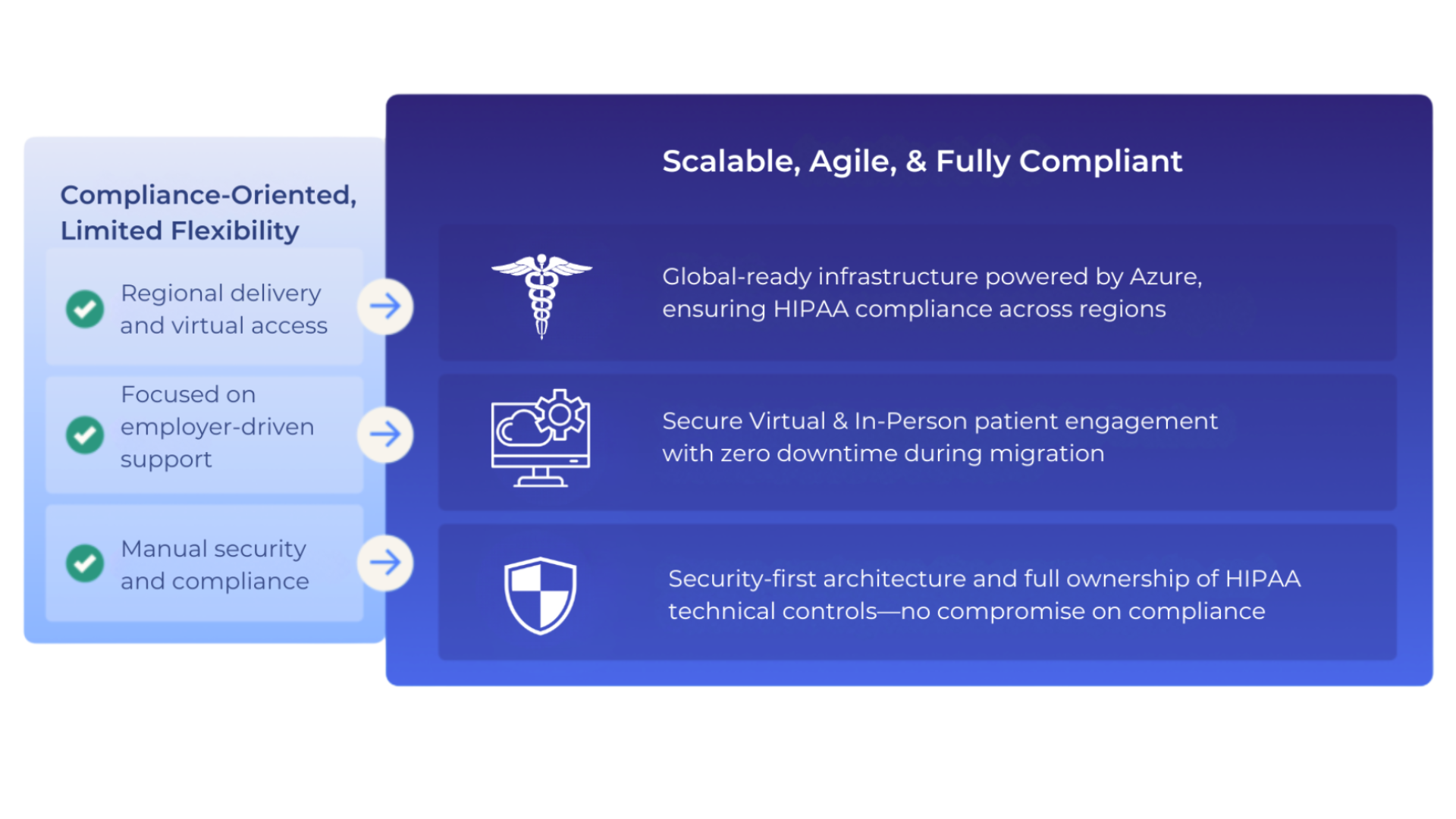 Migrating core infrastructure and services to Azure was a foundational part of the client’s modernization plan. It had to be done with no interruption to care delivery, no data loss, and without impacting end users—many of whom rely on the platform daily for vital health support.