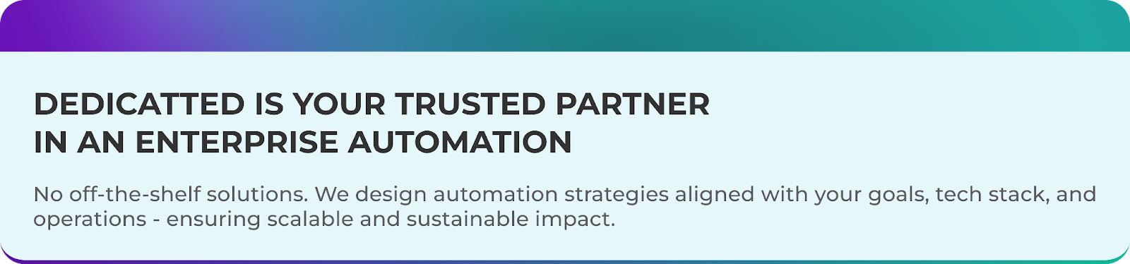 By connecting core systems like Enterprise Resource Planning (ERP), Customer Relationship Management (CRM), and Supply Chain Management (SCM) systems, thereby addressing complex, interrelated processes that span various business units, enterprise automation breaks down silos and enables end-to-end process orchestration. But it’s not just about adding tools. True enterprise automation requires a centralized, scalable approach aligned with broader business goals: transforming automation from a quick fix into a long-term advantage.