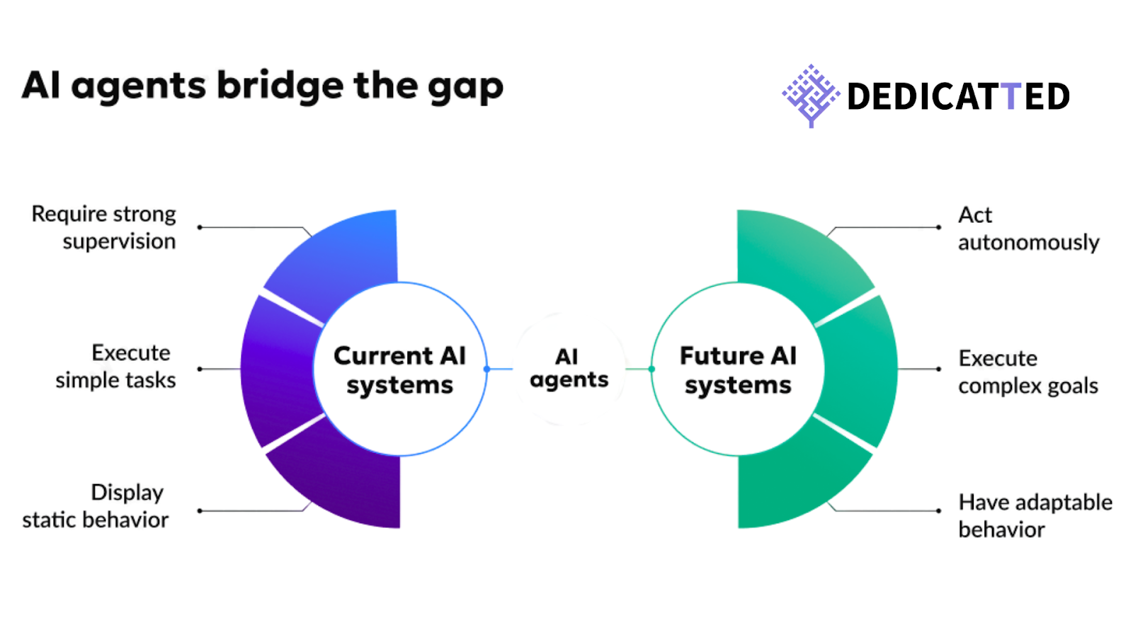 Working with an expert partner like Dedicatted maximizes your chances of success. We can assess your organizational readiness, help you identify high-value use cases, and use these insights to select the ideal architectural approach for your needs. From there, we implement targeted solutions that quickly demonstrate value, build on that success through continuous evaluation, and develop a comprehensive AI Center of Excellence.